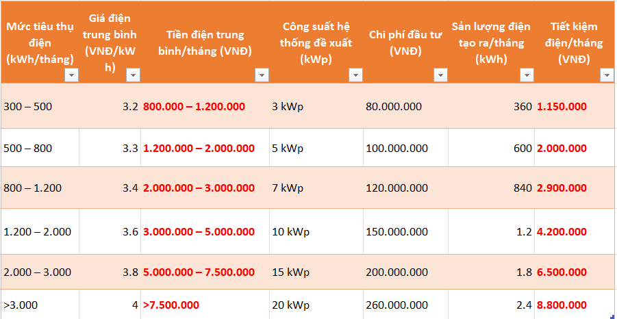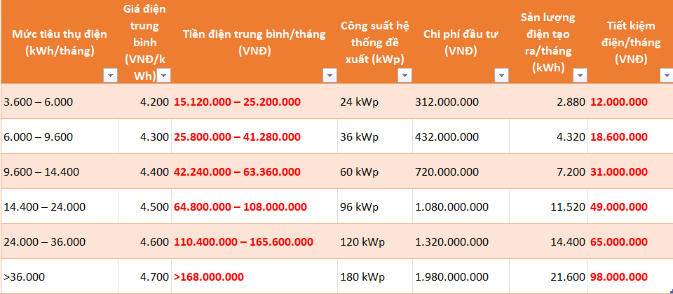 BẢNG GIÁ ĐIỆN MẶT TRỜI