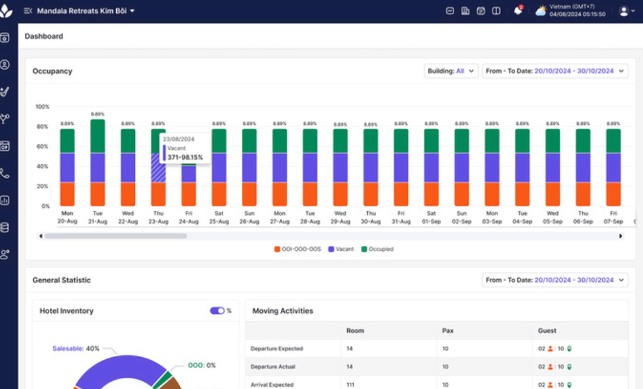 - Tổng quan tình hình hoạt động tức thời: Biểu đồ công suất phòng (Occupancy) trực quan...